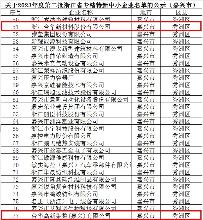 近日,嘉興市經濟和信息化局發布了《關于2023年度第二批浙江省專精特新中小企業名單的公示(嘉興市)》,浙江臺華新材料股份有限公司和臺華高新染整(嘉興)有限公司上榜。