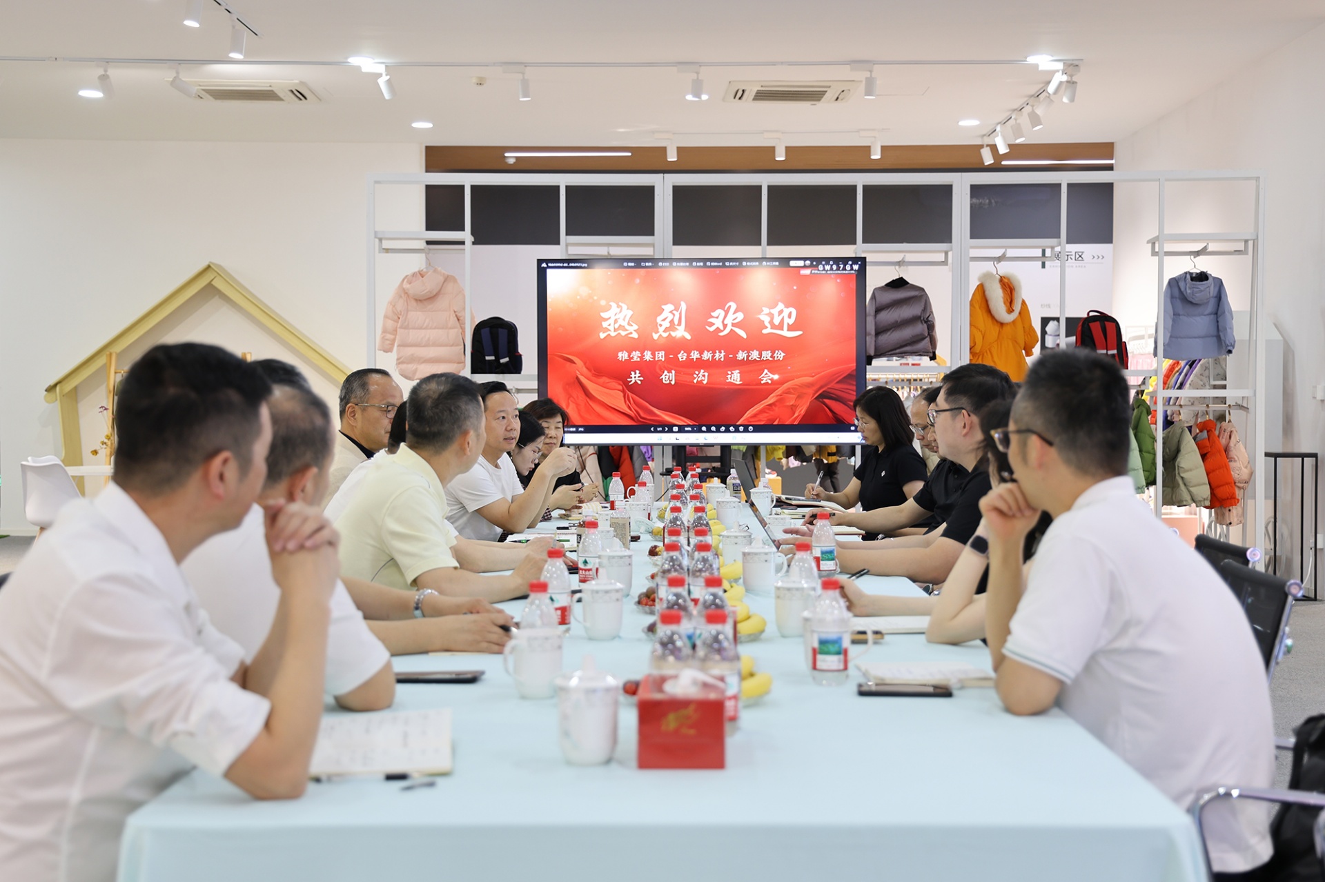 雅瑩集團(tuán)張華明董事長、新澳股份沈建華董事長一行實(shí)地參觀了染整車間和研發(fā)展廳,對(duì)臺(tái)華的產(chǎn)品及研發(fā)有了深入的了解,在隨后的座談會(huì)上,三方就新品創(chuàng)新、研發(fā)合作等方面展開探討和交流,此次共創(chuàng)會(huì)是一次高效的深度對(duì)齊,我們不僅明確了核心目標(biāo)與實(shí)施路徑,更凝聚了跨團(tuán)隊(duì)的共識(shí)與合力,為后續(xù)工作奠定了堅(jiān)實(shí)基礎(chǔ)。